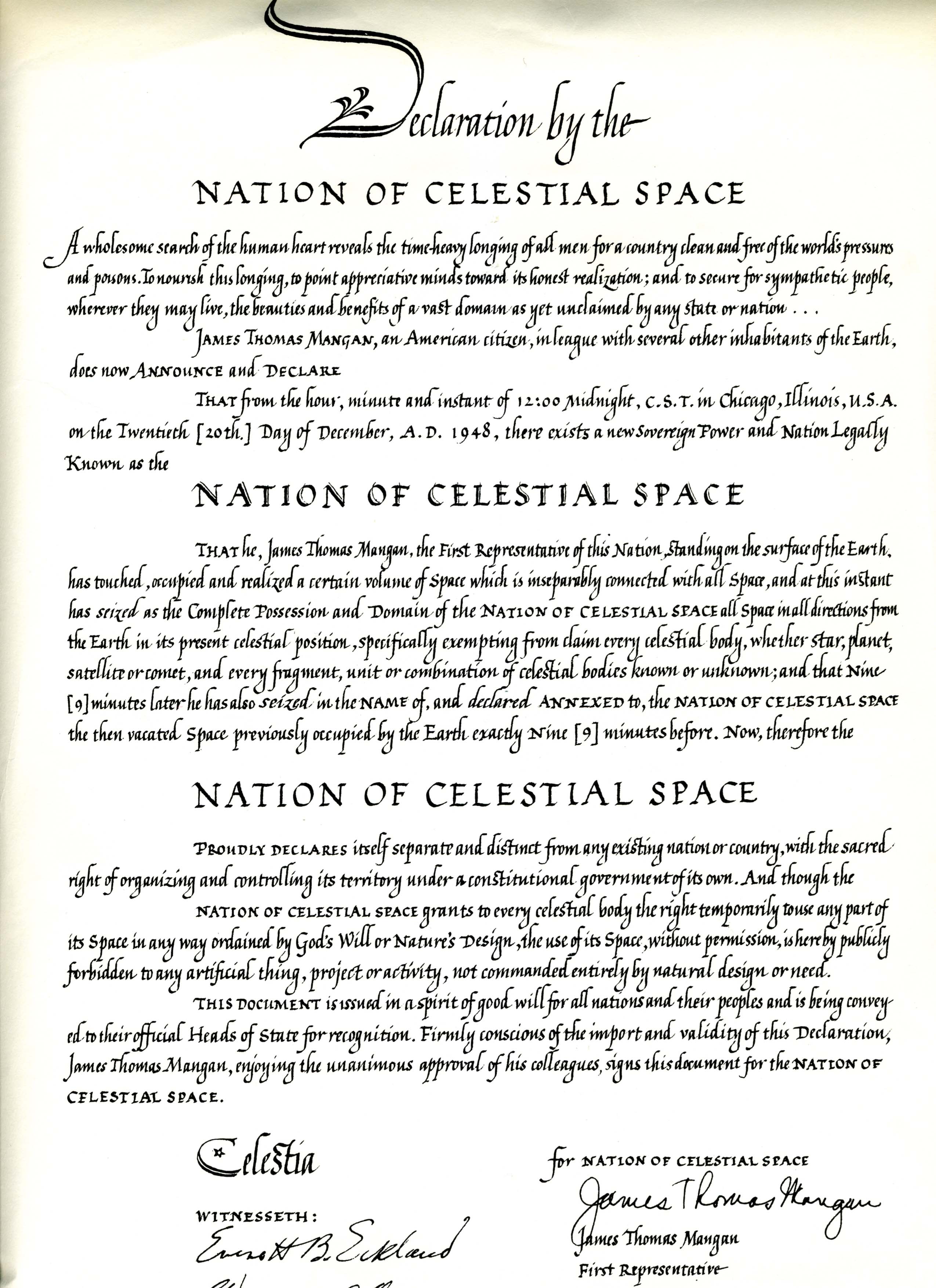 The concept of an outer space nation hit James T. Mangan during a seemingly benign conversation about the sky while gazing out an office window at the Board of Trade Building in Chicago. “There’s plenty of stuff out there,” remarked a business partner while pointing out the window. Mangan wondered who owned it. After careful consideration, he made his claim at the stroke of midnight on December 20, 1948 and created Celestia, The Nation of Celestial Space and gave himself the title First Representative.